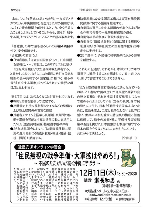 ◆近畿安保オンライン学習会「住民無視の戦争準備・大軍拡はやめろ!」~不屈のたたかいが続く沖縄に学ぼう~ ■講師:瀬長和男さん(沖縄統一連・事務局長) ■11日(木)18:30~20:30 参加費無料。申込締切は12/5(金)大阪安保までご連絡お願いします。 (左段のよびかけビラご覧ください) |