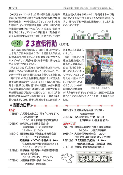 | 23(金) | ◆新年最初の大阪安保23定例宣伝行動 ■日時:23日(金)12:30~ 南森町商店街入り口 |