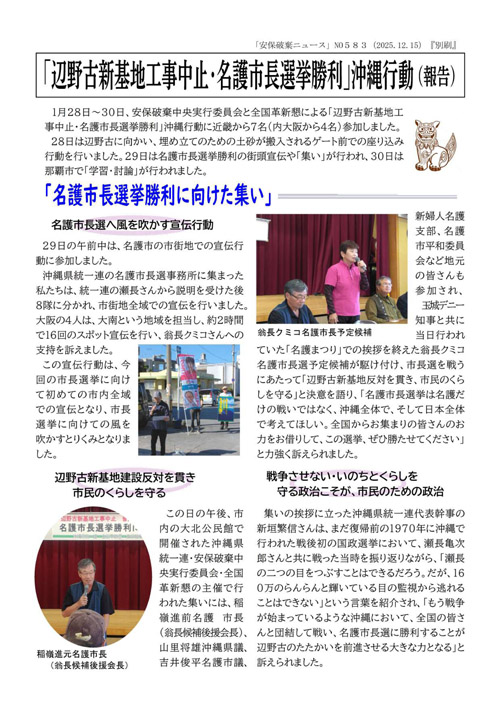 ◆「辺野古新基蓮工事中止・名護市長選挙勝利」沖縄行動《報告》