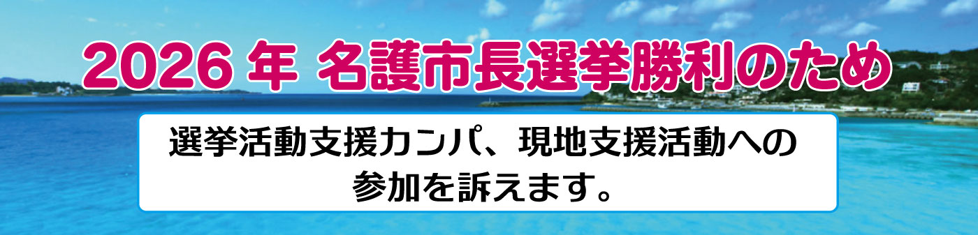 新基地建設を事実上容認して、国から毎年15億円もの再編交付金を受けながら、市民生活を置き去りにし、市民所得が県内11市中最下位にまで落ち込んでしまった名護市政を転換し、誰一人取り残さない、安心して暮らせる平和で豊かな名護市を実現するために、「新基地建設を止め、自然環境を保全し、基地に依存しない地域経済循環を」と訴える翁長クミコさんの勝利を目指して、名護市長選挙を戦うため、選挙活動支援のためのカンパならびに現地支援活動への参加を訴えるものです。