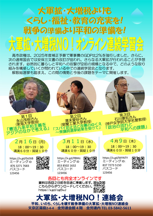 中国や北朝鮮、ロシアなどの「脅威」が過度に喧伝される中で「軍拡もやむなし」という国民感情はあるだろうけれど、だからといって国民は、大軍拡路線をそのまま承認できるものではありません。それどころか、物価高騰が続くのに、依然として実質賃金も上がらず、少ない年金暮らしで、ますます生活因窮が切実になる中で、消費税減税の要求は高まるばかりです。さらに、医療費や社会保険料の負担増で苦しんでいます。