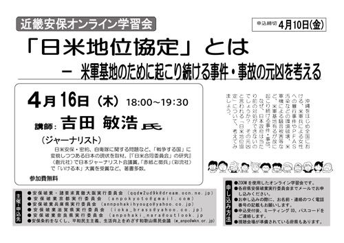 | 16(木) | ◆近畿安保オンライン学習会 内容:「日米地位協定について」 ■日時:16日(木)18:00~19:30 講師 吉田敏浩さん(ジャーナリスト) 参加ご希望の方は大阪安保までご連絡ください。 |