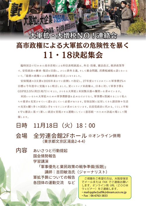 | 18(火) | ◆大軍拡・大増税NO!連絡会「高市政権による大軍拡の危険性を暴く」11.18決起集会 ■日時:18日(火)18:00~ 全労連会館&オンライン(右欄に詳細、案内ビラ掲載) |