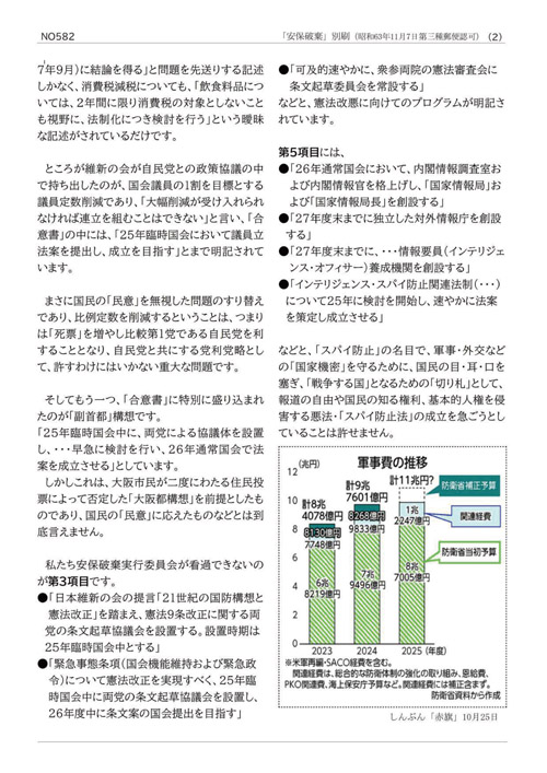 と、これまでの自民党政権の軍事最優先の政策を推進し、まった<維新の会との「合意書」どおりのことが語られています。