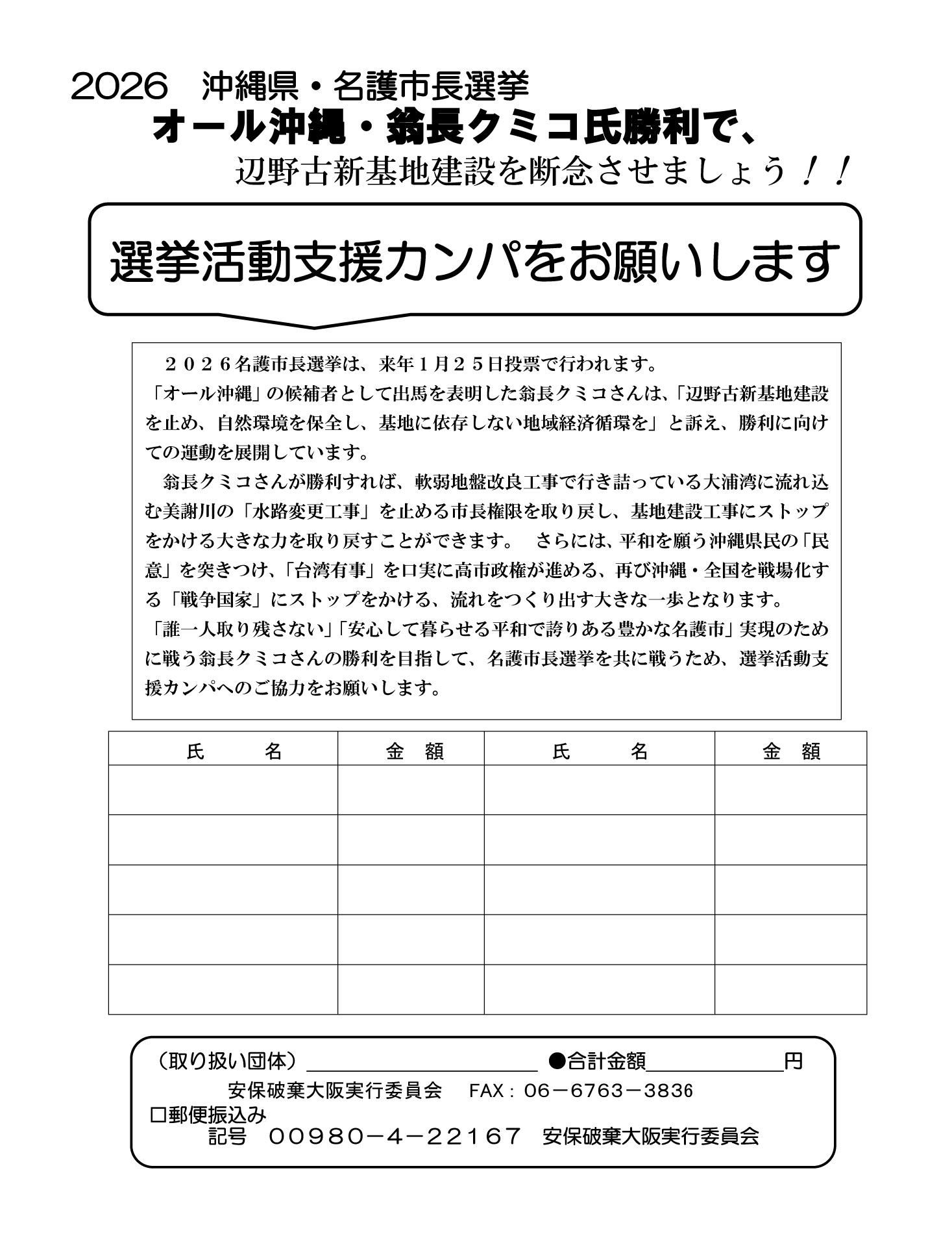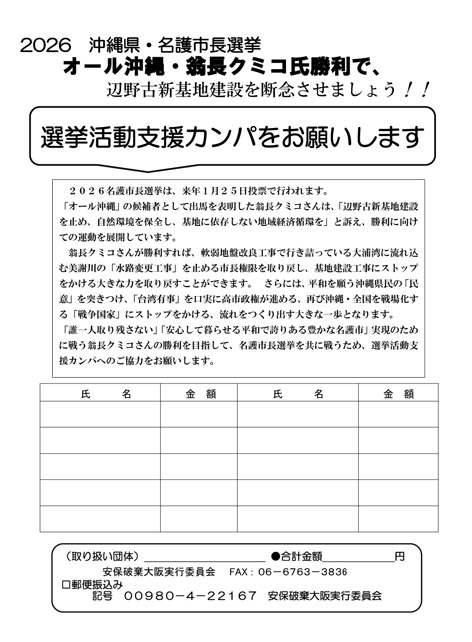 新基地建設を事実上容認して、国から毎年15億円もの再編交付金を受けながら、市民生活を置き去りにし、市民所得が県内11市中最下位にまで落ち込んでしまった名護市政を転換し、誰一人取り残さない、安心して暮らせる平和で豊かな名護市を実現するために、「新基地建設を止め、自然環境を保全し、基地に依存しない地域経済循環を」と訴える翁長クミコさんの勝利を目指して、名護市長選挙を戦うため、選挙活動支援のためのカンパならびに現地支援活動への参加を訴えるものです。