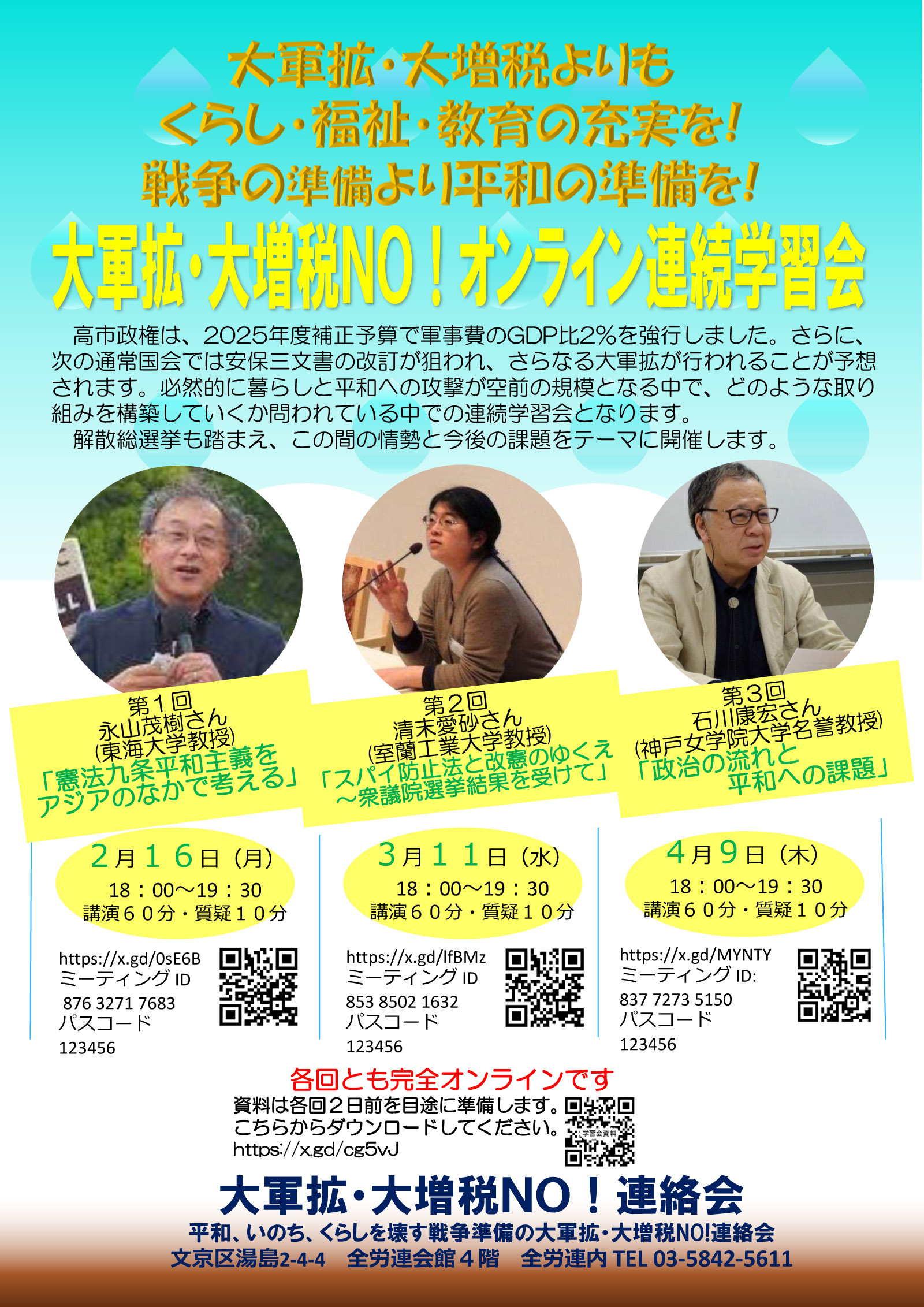 | 4(木) | ◆大軍拡・大増税NO!インライン連続学習会 ■第3回 石川康宏さん(神戸女学院大学名誉教授)「政治の流れと、平和への課題」 ■日時:4日(木)18:00~19:30 (オンライン学習会。案内ビラご覧ください PDFファイル) |
