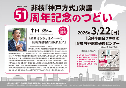 ■記念講演:「敵基地攻撃と日米一体化―防衛費倍増は国民負担に」 講師:半田滋さん(防衛ジャーナリスト・元東京新聞論説兼編集委員) ■13:30~ 神戸駅前研修センター&ZOOMオンライン 資料代1,000円 主催:非核「神戸方式」決議記念実行委員会 (会場&ZOOMオンライン学習会。案内ビラご覧ください) |