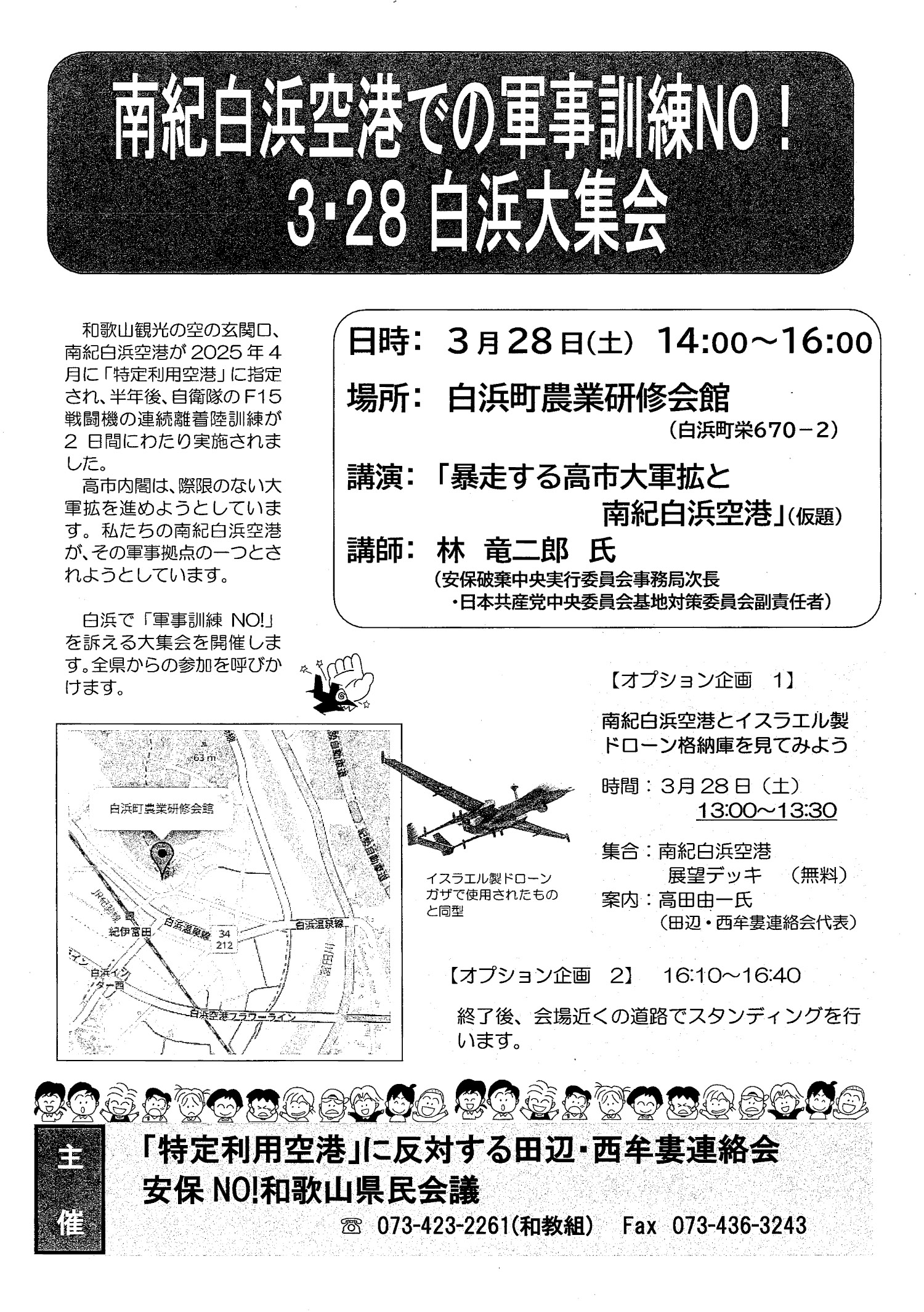 | 28(土) | ◆南紀白浜空港での軍事訓練NO!3・28白浜大集会 ■講演:「暴走する高市大軍拡と南紀白浜空港(仮題)」 ■講師:林竜二郎さん(中央安保事務局次長・日本共産党中央委員会基地対策委員会副責任者) ■14:00~16:00 白浜農業研修会館 主催:「特定利用空港」に反対する田辺西牟婁連絡会、安保NO!和歌山県民会議(案内ビラご覧ください PDFファイル) |