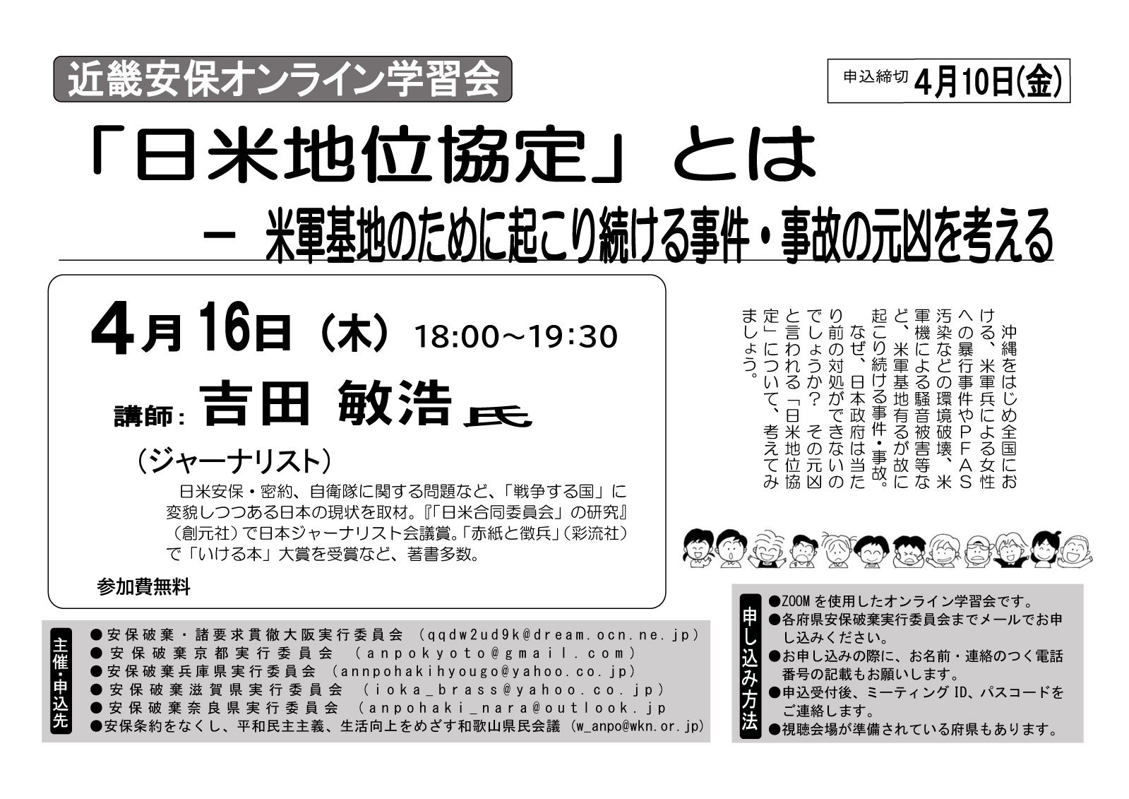 | 16(木) | ◆近畿安保オンライン学習会 内容:「日米地位協定について」 ■日時:16日(木)18:00~19:30 講師 吉田敏浩さん(ジャーナリスト) 参加ご希望の方は大阪安保までご連絡ください。 (PDF案内ビラ) |