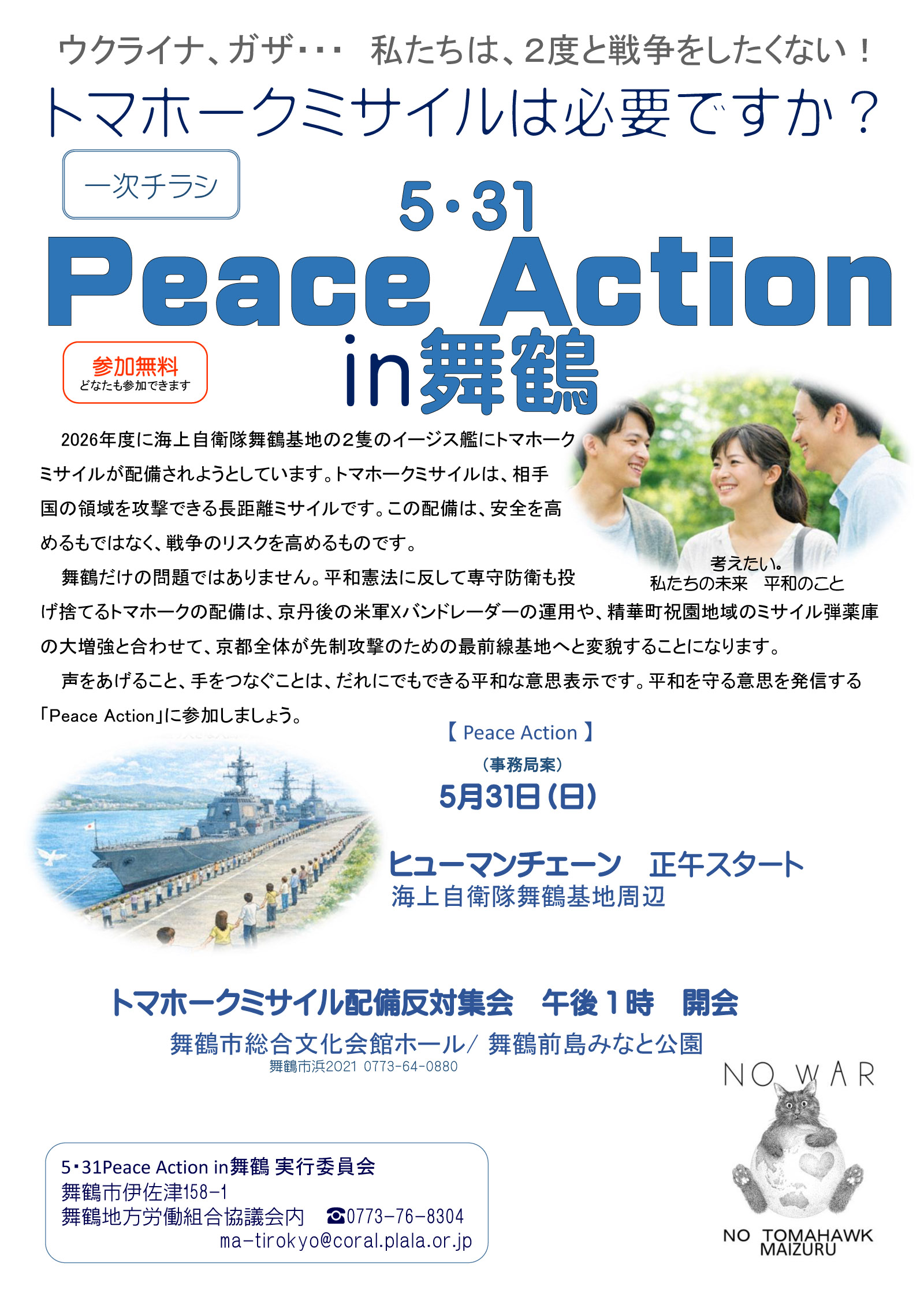 | 31(日) | ◆5・31Peace Action in 舞鶴 ウクライナ、ガザ・・・ 私たちは。2度と戦争をしたくない!トマホークミサイルは必要ですか? ■ヒューマンチェーン 12:00スタート(海上自衛隊舞鶴基地周辺) ■トマホーク配備反対集会 13:00~ 舞鶴市総合文化ホール/舞鶴前島みなと公園 (PDF案内PDF) |