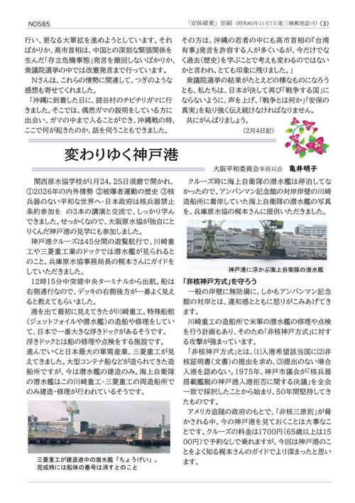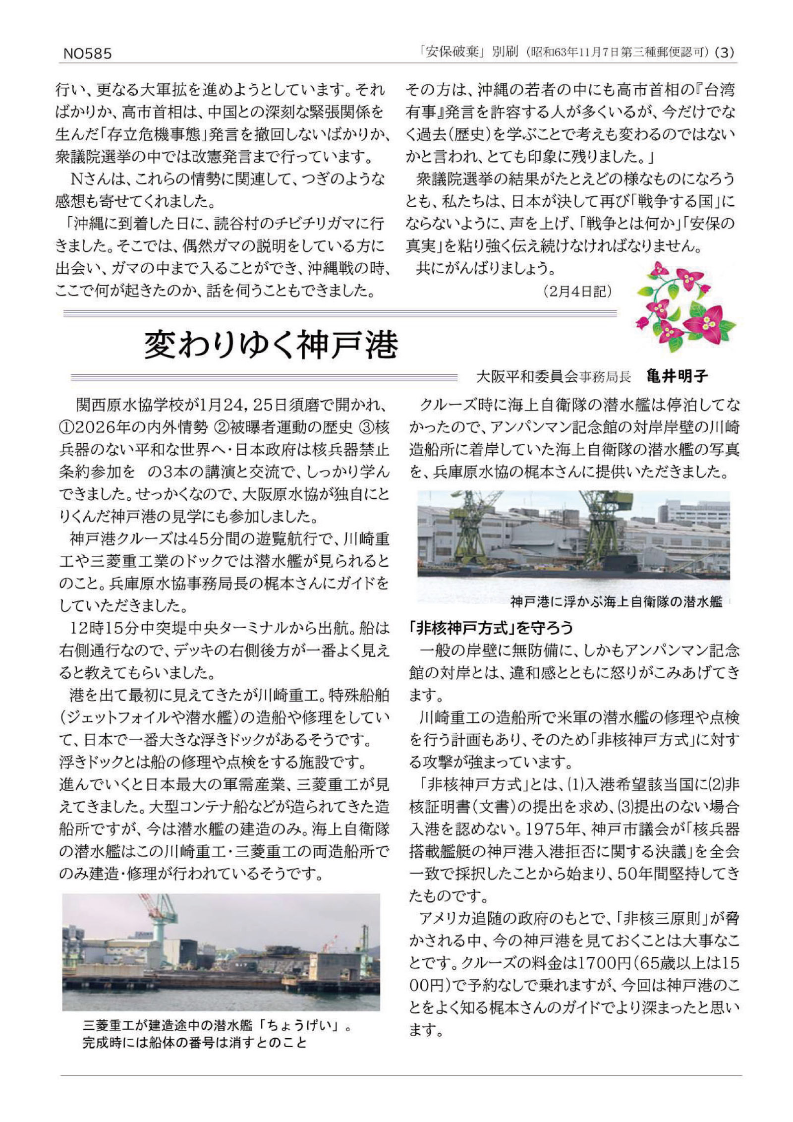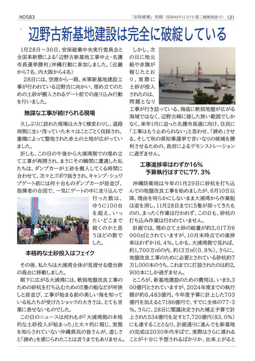 また、国会では経済と軍事を結び付け、日本をアメリカの安全保障戦略に組み込むことを狙った経済安全保障法案が衆議院で採択され、国交相が沖縄県による辺野古新基地建設変更申請「不承認」を取り消す裁決を行うなど、ますます前のめりに「戦争する国」へと進もうとする動きがあります。