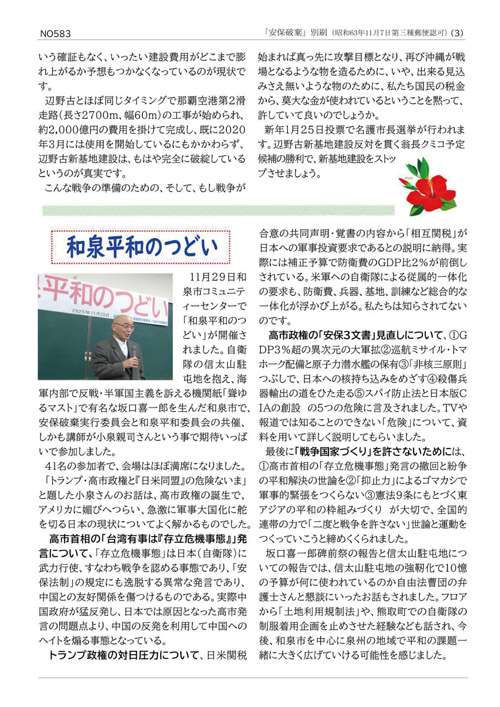 ◆11月28日~30日、安保破棄中央実行委員会と全国革新懇による「辺野古新基地工事中止・名護市長選挙勝利」沖縄行動に近畿から7名(内大阪から4名)参加しました。
