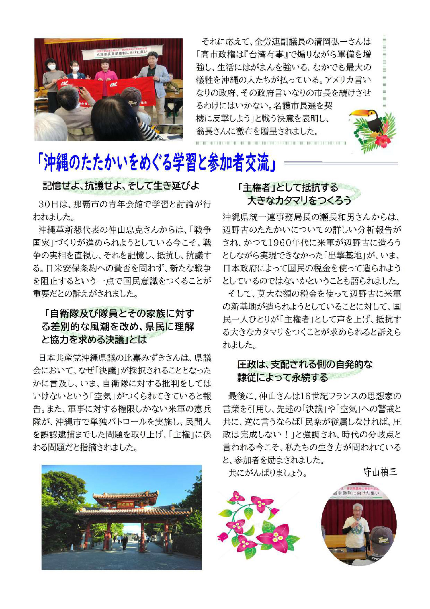 28日は辺野古に向かい、埋め立てのための土砂が搬入されるゲート前での座り込み行動を行いました。29日は名護市長選挙勝利の該当宣伝や「集い」が行われ、30日は那覇市で「学習討論」が行われました。