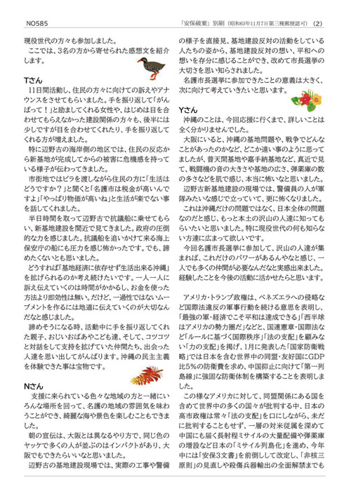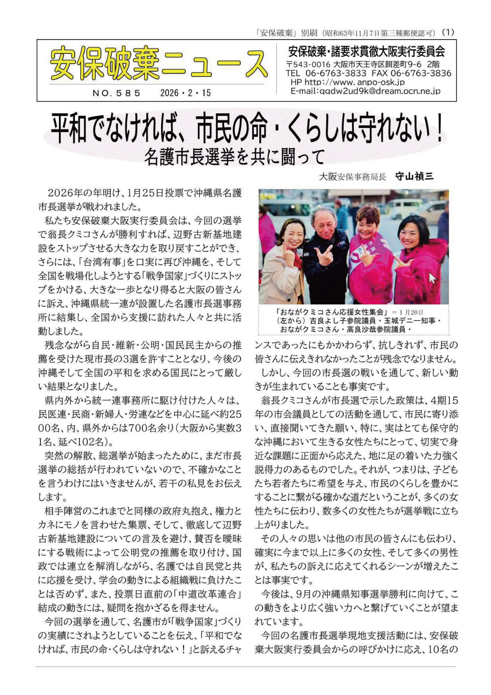 私たち安保破棄大阪実行委員会は、今回の選挙で翁長クミコさんが勝利すれば、辺野古新基地建設をストップさせる大きな力を取り戻すことができ、さらには、「台湾有事」を口実に再び沖縄を、そして全国を戦場化しようとする「戦争国家」づくリにストップをかける、大きな一歩となリ得ると大阪の皆さんに訴え、沖縄県統一連が設置した名護市長選事務所に結集し、全国から支援に訪れた人々と共に活動しました。